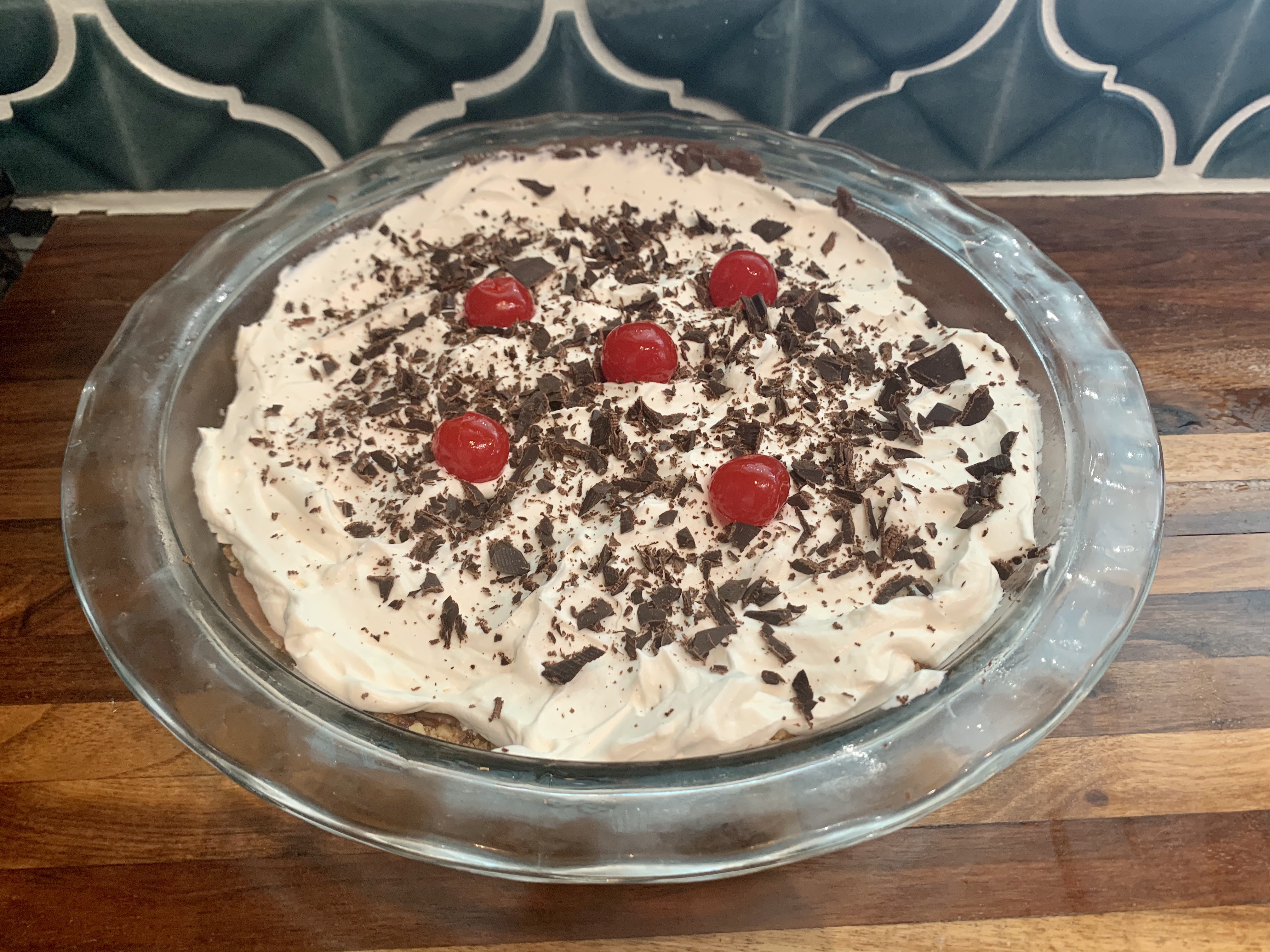 Garnish pie with chocolate flakes and raspberries, if desired.